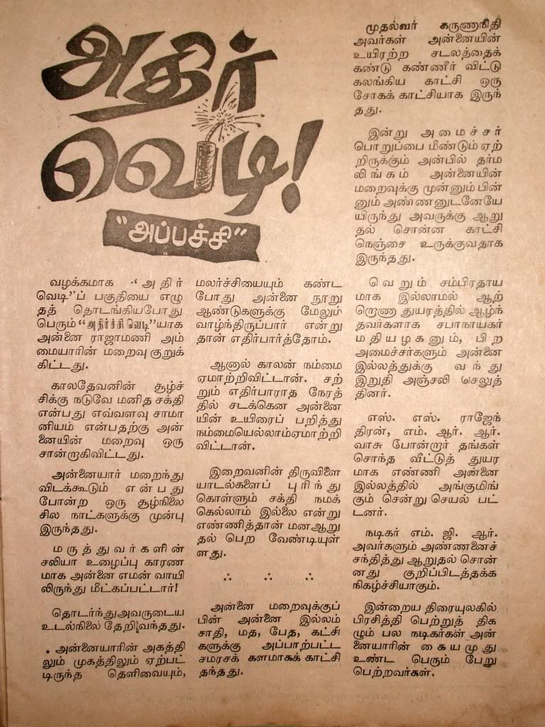 இந்த மரணமும் 1975 அக்டோபர் முதல் தேதியிலிருந்து துவங்கி நடந்த நிகழ்வுகளும் (கர்மவீரரின் மறைவிலிருந்து துவங்கி...). விதி என்ற ஒன்றை நம்பாதவனும் நம்பித் தொலைக்க வேண்டியிருக்கிறது. திரு. முரளி அவர்கள் மிகச் சரியாக நினைவு கூர்ந்திருந்தார்.