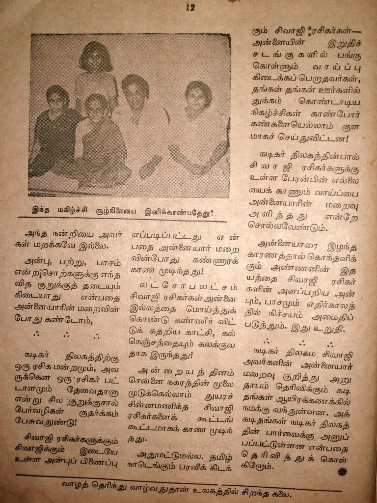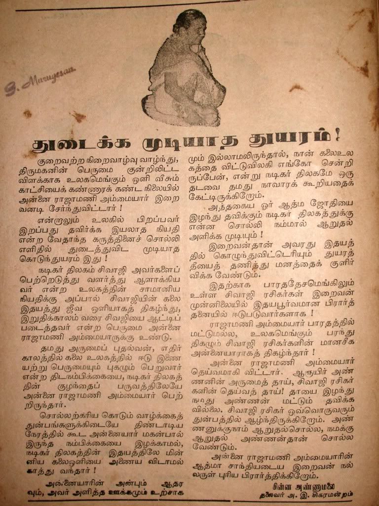 அந்த நேரத்தில்தான் வயதில் மூத்த சில நண்பர்கள் மூலம் அவர் அகில இந்திய சிவாஜி மன்றத் தலைவராக இருந்தவர் என்ற தகவலையும், தர்மராஜா படத் தயாரிப்பாளர், காமராஜரின் தொண்டர், தன்னுடைய பிறந்த நாள் அன்றே ( மணிவிழா அன்று) மறைந்து விட்டார் என்ற தகவல்களையும் அறிந்தேன்.