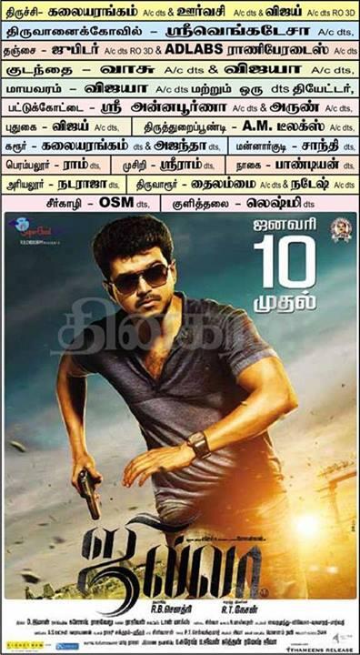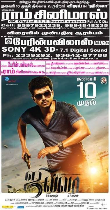 Jilla, starring Mohanlal, Vijay, Kajal Aggarwal, Mahath, Ravi Mariya, Soori, Niveda Thomas, Thambi Ramaiah and a long list of other supporting casts, is making its route clear for a storming release on January 10th. The movie is directed by R.T Neason and produced by R.B. Choudary under the banner Super Good Films.