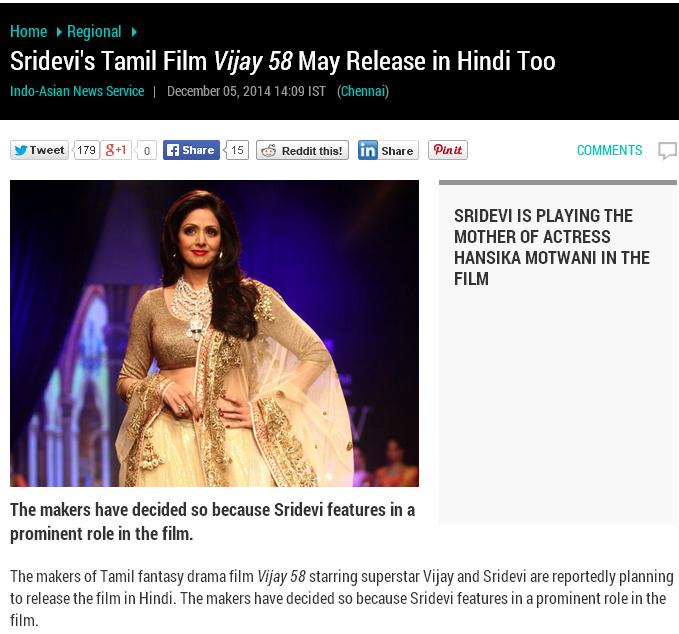 Vijay's upcoming 58th film by Chimbudevan, with a plethora of big co-stars such as Sridevi, Sudeep, Hansika and Shruti Haasan, is similarly expected to thrash box-office records in all the aforementioned markets. The film is being made as a Tamil - Telugu bilingual and we also hear that it is likely to be dubbed and released in Hindi. Many corporates are said to have expressed interest in the Hindi dubbing, release rights of 'Vijay 58' including Eros International.