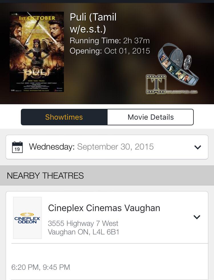 #Puli Canada Premier confirmed at 6 locations in Grater Toronto Area Record number of Premier locs for a Tamil movie! https://pbs.twimg.com/media/CP4B2MGWEAAQu9-.jpg