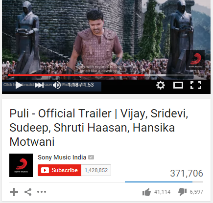 With unparalled fan frenzy and grave anticipation, the trailer of Puli was unveiled last night. The trailer clocked 2.25 lakh views in just 1 hour of release without too many celebrity endorsements and riding solely on the massive fan base of Ilayathalapathy Vijay. As of now (9.30 AM), the trailer has racked up around 3.5 lakh hits in YouTube.