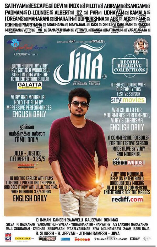 Vijay`s Jilla is reported to have grossed an awesome Rs 2.52 Crore in five days (Jan 10- 14), and is in the number one spot on CBO. Veeram which had better WOM (word-of-mouth) is marginally behind due to smaller audis, and is in the number two slot. Both these films dominated nearly 85 % of the screens and shows in Chennai city.