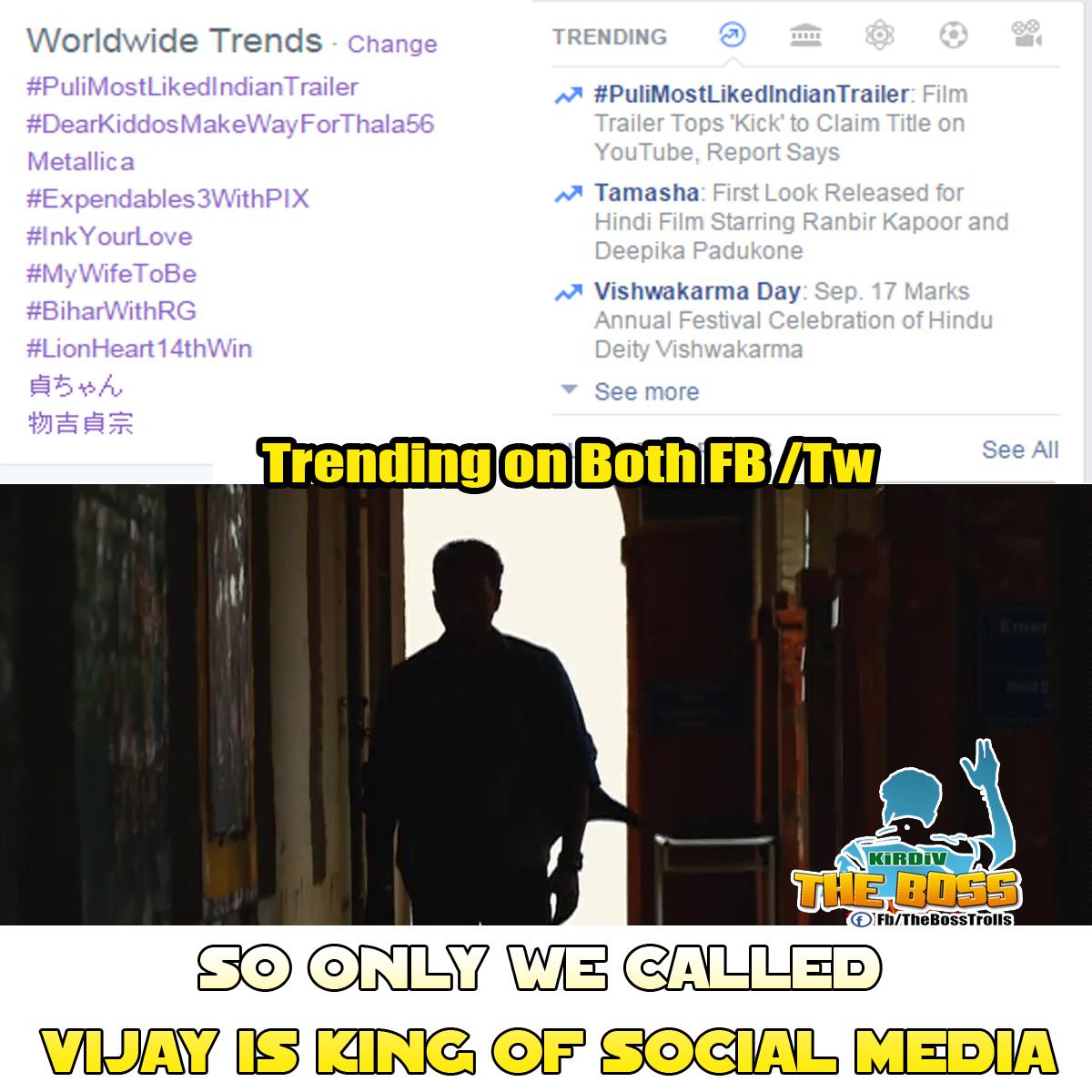 If Vijay is King of Box Office, Vijay fans are King of Social media #PuliMostLikedIndianTrailer Congrats @SonyMusicSouth @SKTStudios