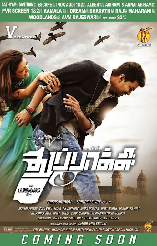 V Creations’ Kalaipuli S Thanu, in association with Gemini Film Circuit. Says Thanu, “We’re excited about the film because of the entire team that has worked on it. Ilayathalapathy Vijay has proved many times that he is darling of the masses as he appeals to all sections of the audience. His combination with Murugadoss, a director who has never seen failure, will be one to watch out for. Also, we’re privileged to have Santosh Sivan as our cinematographer.” The music by Harris Jayaraj has already struck a chord with audiences, with the Google Google… number proving to be quite popular with the college youth. The trailer of the film, which showcases the Ilayathalapathy at his