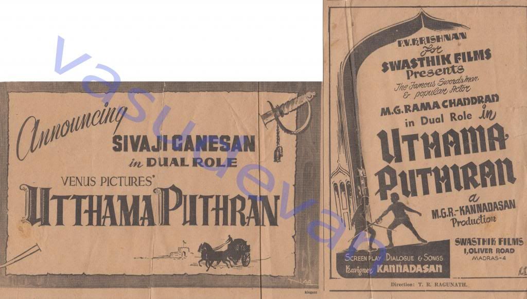 நடிகர் திலகம், மக்கள் திலகம் என்ற இரு திலகங்களும் நடிப்பதாக ஒரே சமயத்தில், ஒரே பக்கத்தில் இடதும், வலதுமாக ஆங்கில நாளிதழ் ஒன்றில் வெளிவந்த 'உத்தம புத்திரன்' பட விளம்பரம்.