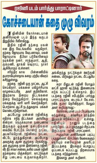 கோச்சடையானின் முதல் ட்ரைலர் ர*ஜினிக்கு பிடிக்கவில்லை அதனால்தான் ட்ரைலரை மேம்படுத்த கூறியிருக்கிறார் என கிசுகிசுக்கிறார்கள்.