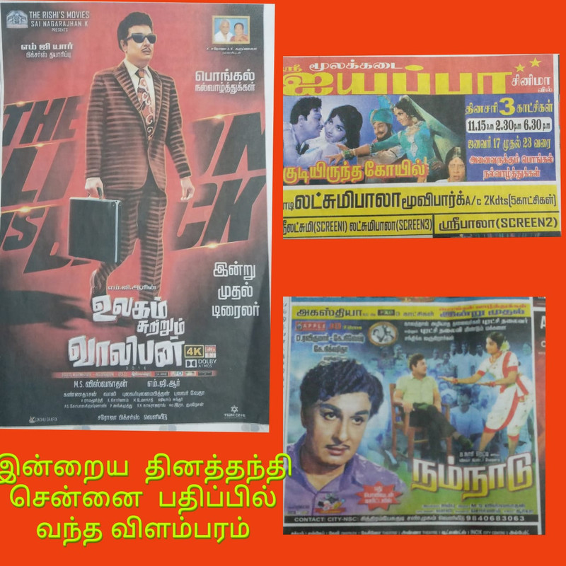 பொன்மனச்செம்மல் எம்ஜிஆர் அவர்களின் விருப்பமான திருநாள் பொங்கல் பண்டிகை அந்தப்பண்டிகையை சிறப்பிக்க மதுரை ஜெய்ஹிந்த்புரம் அரவிந்த் டி.டி.எஸ் புரட்சித்தலைவர் நடித்த நாடோடிமன்னன் சென்னை அகஸ்தியா.டி.டி.எஸ் கலைக்கடவுள் எம்ஜிஆர் அவர்களின் நம்நாடு கோவை சண்முகா பாரதரத்னா எம்ஜிஆர் அவர்களின் அடிமைப்பெண் பழநி.சாமி திரையரங்கில் மணிதமகான் எம்ஜிஆர் அவர்களின் அடிமைப்பெண் நெல்லை மாவட்டம் தென்காசி புளியங்குடி கண்ணா திரையரங்கில் கலைக்கடவுள் எம்ஜிஆர் அவர்களின் எங்கவீட்டுப்பிள்ளை நெல்லை மாவட்டம் விக்கிரரங்கபுரம் தாய்சினிஸ் திரையரங்கில் வெற்றித்திருமகன் எம்ஜிஆர் அவர்களின் எங்கவீட்டுப்பிள்ளை வெற்றிப்பவனி மேலும் தகவல்கள் வருகின்றன திரையிட்ட திரையரங்க உரிமையாளர்கள் திரைப்பட விநியோகஸ்தர்கள் கண்டுமகிழும் அனைத்து ரசிகப் பெருமக்களுக்கும் மதுரை மாநகர் மாவட்ட எம்ஜிஆர் மன்றம் சார்பில் எனது உளமார்ந்த நல்வாழ்த்துக்கள் இதயங்கனிந்த உள்ளம்மகிழ்ந்த நன்றிகள் ... மதுரை எஸ் குமார் ...எம்ஜிஆர் மன்றம்... Thanks.........