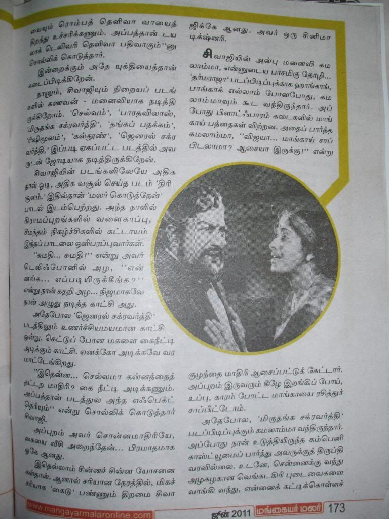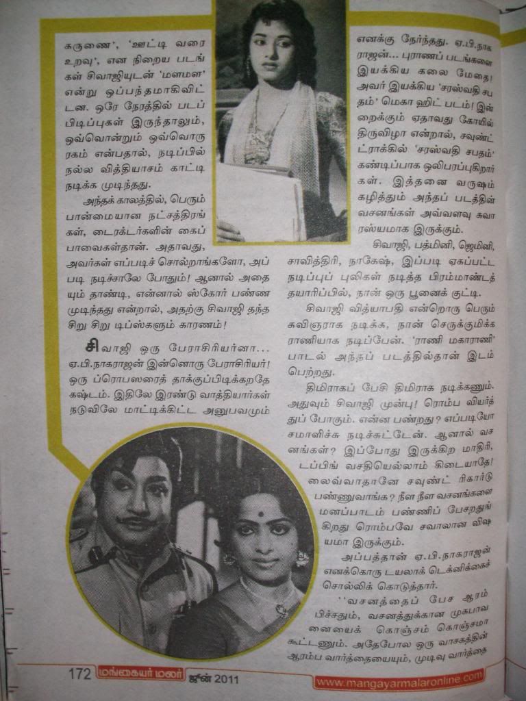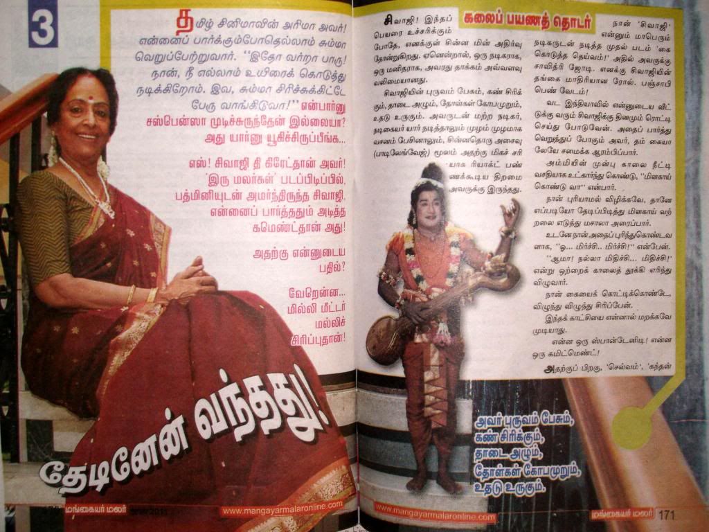 Actually, here he invokes comedy with a subtle sense of satire, and elegant ripostes. Not at all easy - when you talk about comedians and heros doing comedy, it is a particular aspect of comedy that they master(Kamal being the later exception ofcourse). They have their brand of comedy that they excel in - with NT, you get the whole range. You sense that the disrespectful, no-holds-barred, sarcastic, whip-tongued, remorseless prankster is a persona that NT had hidden under his real-life nice-guy persona. He brings it out with vengeance here, resulting in much hilarity and a sense of awe at a man who can, at will, bring out a whole new persona you never knew existed in him. What I mean is it is not like he is acting out muradan muthu - that impish muradan had been residing inside him for all these years, and this story was just an outlet for one of the thousand myriad multiple personalities that NT played host to in his mind.