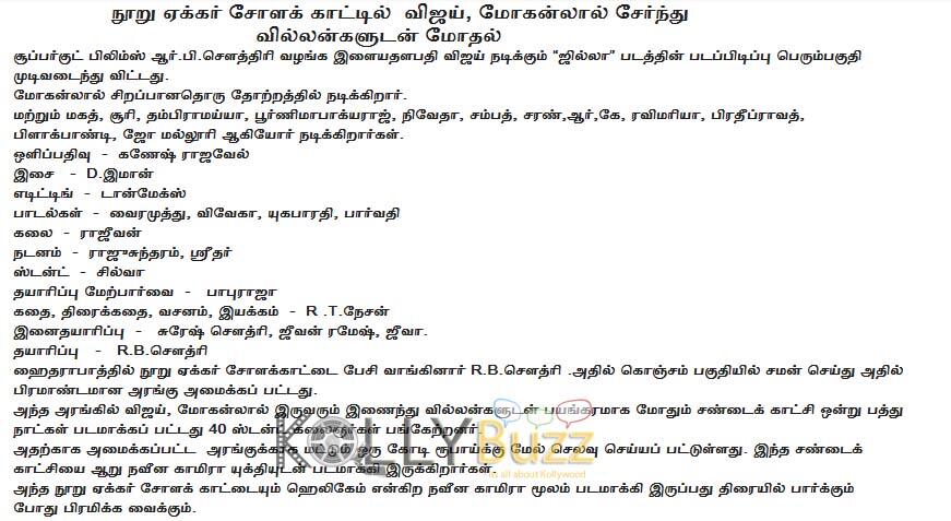 Jilla is directed by RT.Neason and produced by Super Good Films. Music is composed by D.Imman and the album is getting released on December 21st whereas the film is scheduled for Pongal release.