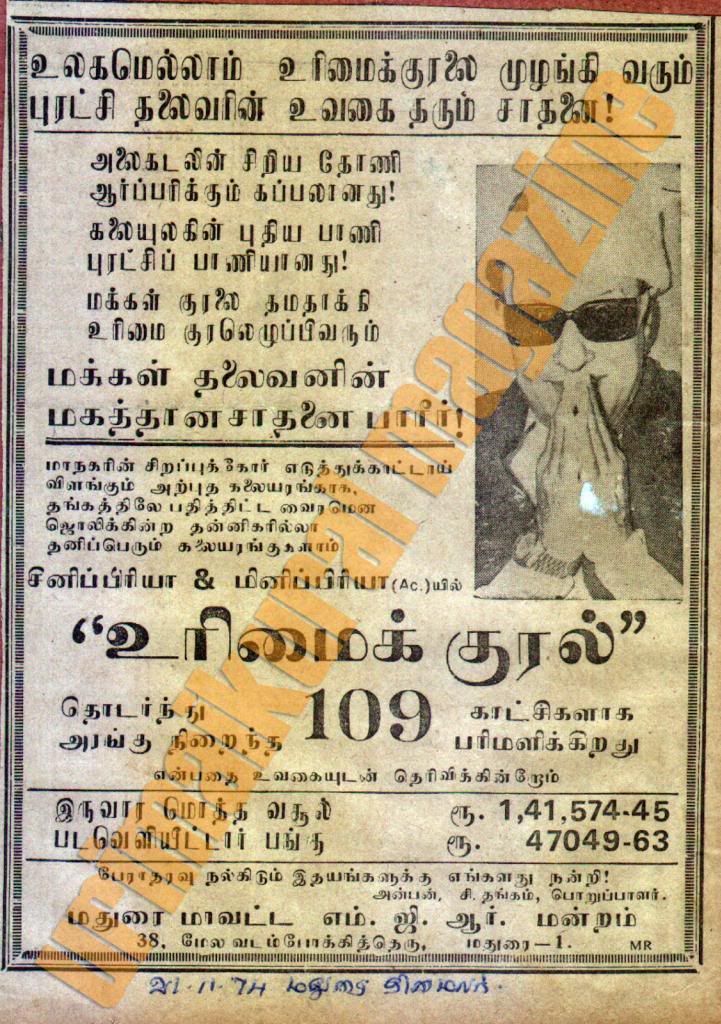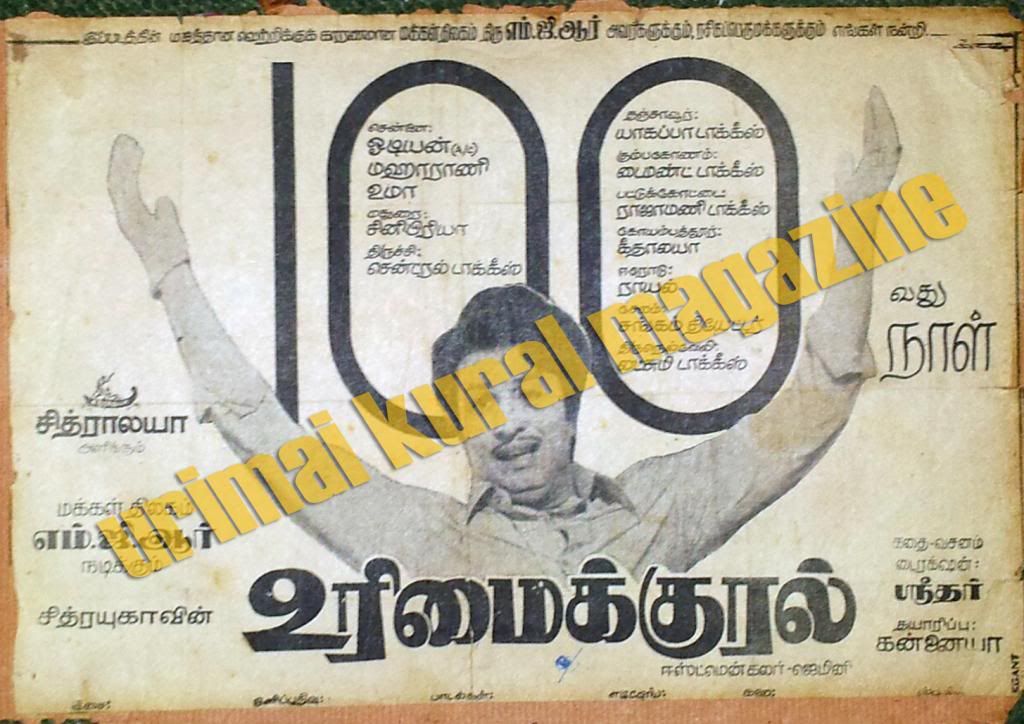 உரிமைக்குரல் பற்றி எனக்கு தெரிந்த தகவல்..உரிமைக்குரல் ஸ்ரீதர் படம் என்றாலும் பெரும்பாலான காட்சிகள் எம்ஜிஆரின் ஆலோசனைப்படியே எடுக்கப்பட்டது..உதாரணத்திற்கு ஒன்று சொல்ல வேண்டுமானால், விழியே கதை எழுது பாடல்...முதலில் இந்த பாடல் முழுவதும் ஆற்றங்கரையிலே சோகப்பாடலாக எடுக்க தீர்மானிக்கப்பட்டது..அப்போது மக்கள் திலகம் குறுக்கிட்டு இதில் ஒரு கனவு காட்சியை சேருங்கள் என்று சொல்லியிருக்கிறார்..ஸ்ரீதர் அவர்களுக்கு அதில் கொஞ்சமும் விருப்பமில்லை..வேண்டாமே அப்படியே இருக்கட்டும் என்றார்..ஆனால் தலைவர் அவர்களோ நீங்கள் கனவு சீன் வையுங்கள்..நிச்சயம் நன்றாய் இருக்கும்..அனைவரையும் இழுக்கும் என்றார்...ஸ்ரீதர் அரை மனதோடு ஒத்துக்கொண்டார்..மேலும் அந்த கனவு காட்சியில் தேவ தூதர்கள் போல இறக்கை வைக்க சொல்லவும் ஸ்ரீதருக்கு மிகவும் பயமாக போய்விட்டது..எம்ஜிஆர் வற்புறுத்தலால் அதுவும் நிறைவேறியது..படம் ரிலீஸ் ஆகி அந்த பாடலுக்கு மக்களிடம் கிடைத்த வரவேற்பை பார்த்ததும்தான்..எம்ஜிஆரின் மீது ஸ்ரீதருக்கு மேலும் மதிப்பு கூடியது..இவர் இயக்குனருக்கே இயக்குனர் என புகழ்ந்தார்...அந்த பாடல் இன்னும் சாகா வரம் பெற்றிருக்கிறது..மேலும் ஒரு தகவல்...பல படங்கள் எடுத்து ஸ்ரீதரின் சித்ராலய நிறுவனம் பெரும் கடனில் சிக்கியபோது, ஹீரோ 72 (பின்னர் வைர நெஞ்சம்) என்ற படத்தை முடிக்க முடியாமல் தவித்தபோது..எம்ஜிஆரை வைத்து படம் எடுங்கள் உங்கள் பிரச்சினைகள் எல்லாம் தீரும் என்று யோசனை சொன்னவர் ஹிந்தி நடிகர் ராஜேந்திர குமார்..தலைவரும் ஆபத்தாண்டவனாக ஸ்ரீதருக்கு குறுகிய காலத்திலே ஒரு பெரிய வெற்றி படத்தை முடித்து கொடுத்து ஸ்ரீதரின் கடன் சுமையைக் குறைத்து அவர் வாழ்க்கையில் விளக்கேற்றி ஒளிவிளக்கானார்.