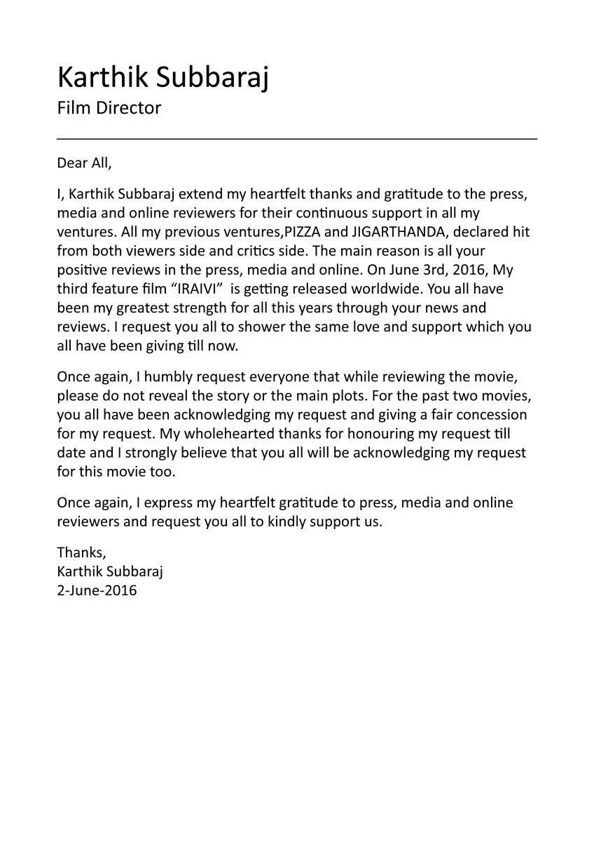 karthik subbaraj @karthiksubbaraj Jun 3 #Iraivi is now all urs.Sure it will be a worthy experience in theaters.PLS DONT REVEAL STORY!! sincere request.Thanks for d support so far..