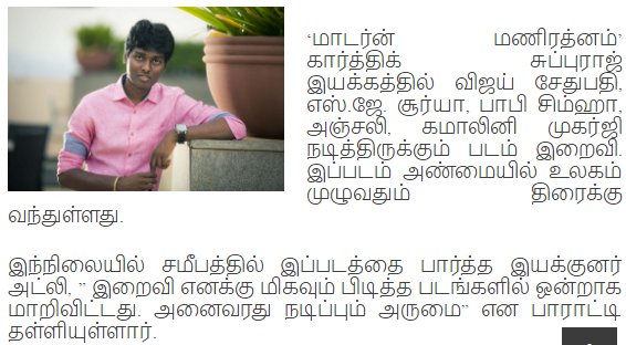 kollywood @cine_news1 Jun 3 #iraivi stellar performances from Vj sethupathi and sj surya @karthiksubbaraj Vera level director of cinemahttps://abs.twimg.com/emoji/v2/72x72/1f44c.pnghttps://abs.twimg.com/emoji/v2/72x72/1f44c.png @iam_SJSuryah @VIJAYSETHUFANS